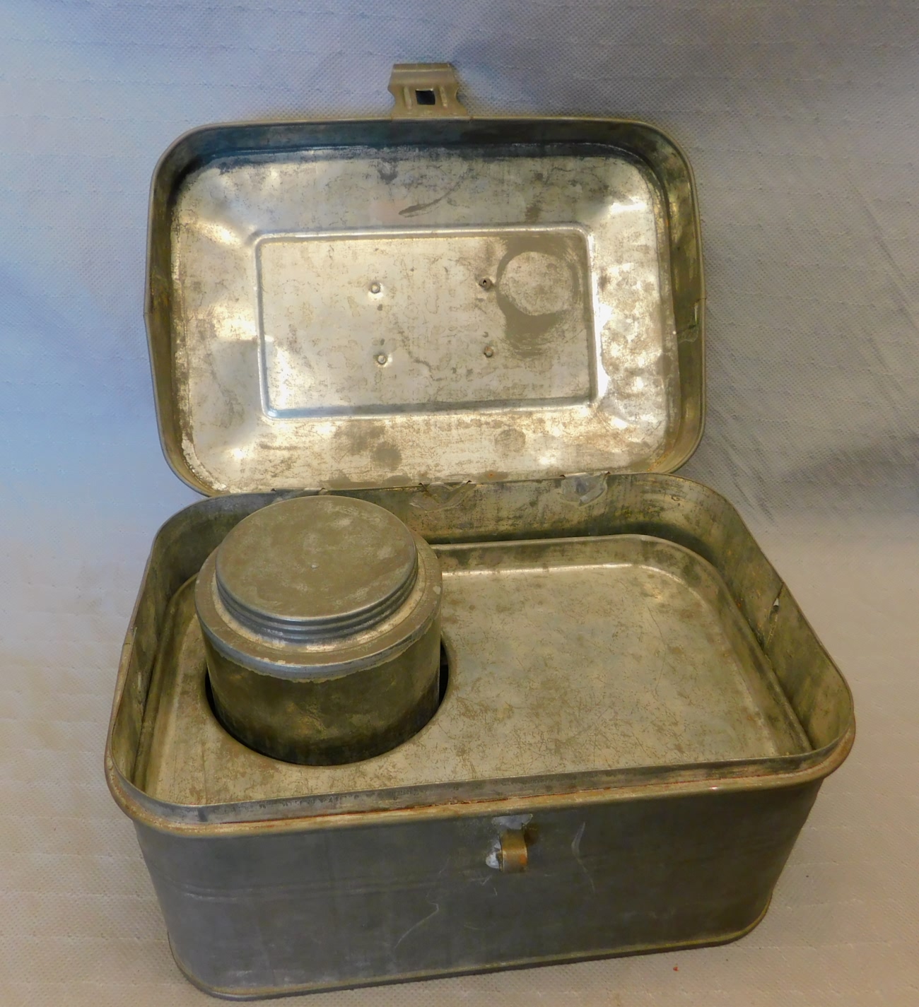 This tin miners lunch pail is in great condition. It has a shelf and screw top