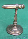form. The base is heavily decorated ornate cast iron. The riser is turned brass with a pleasing design. The barrel is a bullet like design.